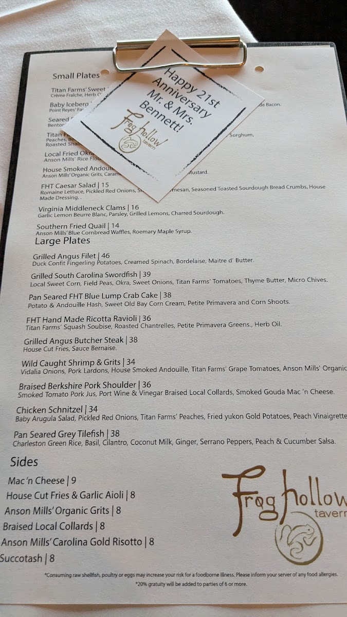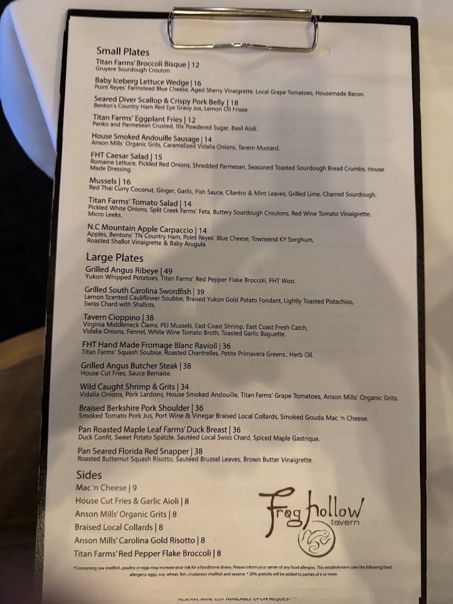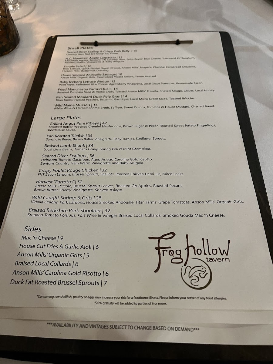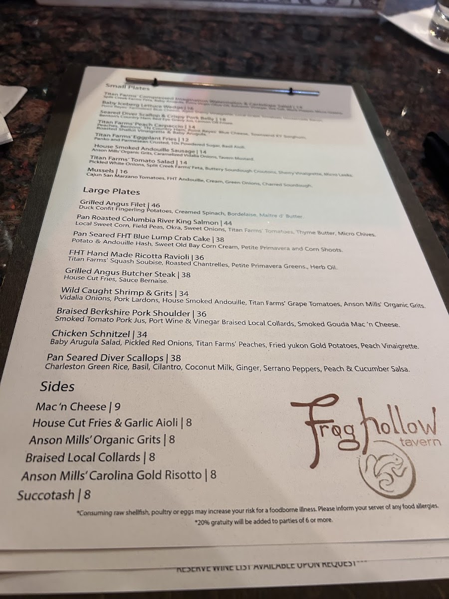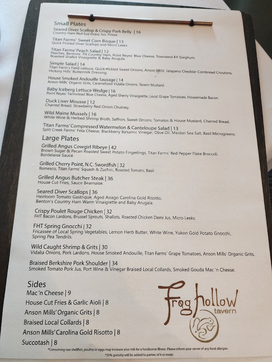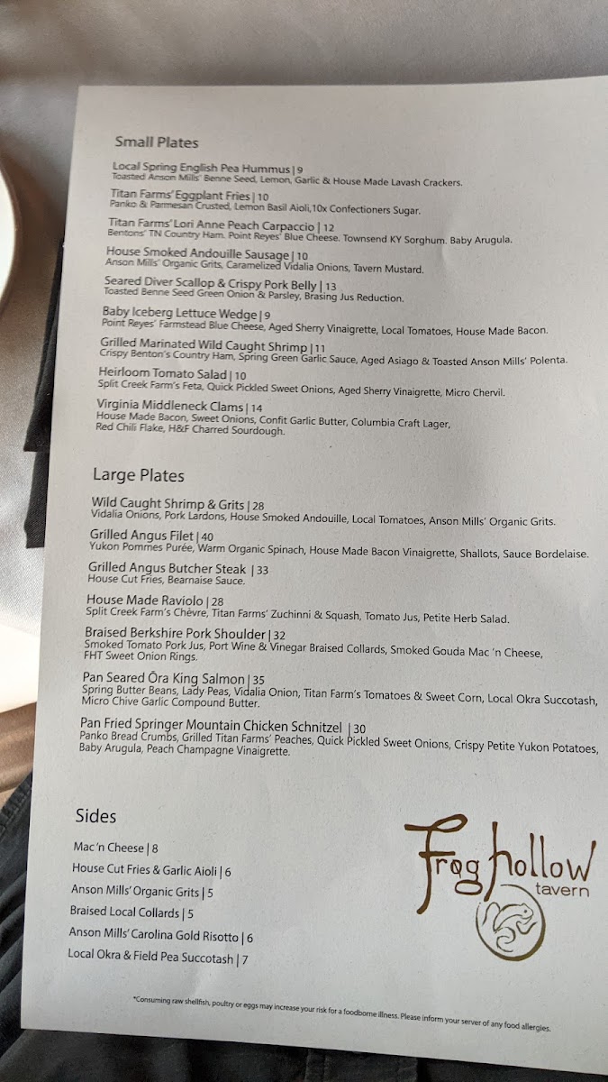 Frog Hollow Tavern Menu