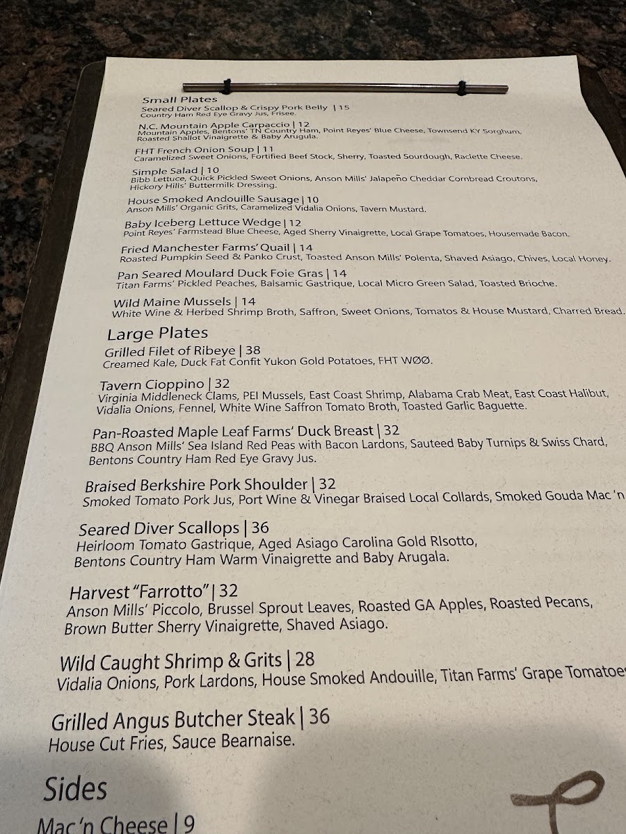 Guests can expect standout dishes such as expertly grilled Angus ribeye and tender filet mignon, alongside seasonal offerings like scallops served with creamy risotto or a fresh autumn salad featuring mixed greens, pears, and bleu cheese. Sides range from house-cut fries with garlicky aioli to rich mac and cheese and locally sourced collard greens, providing satisfying complements to each main course.